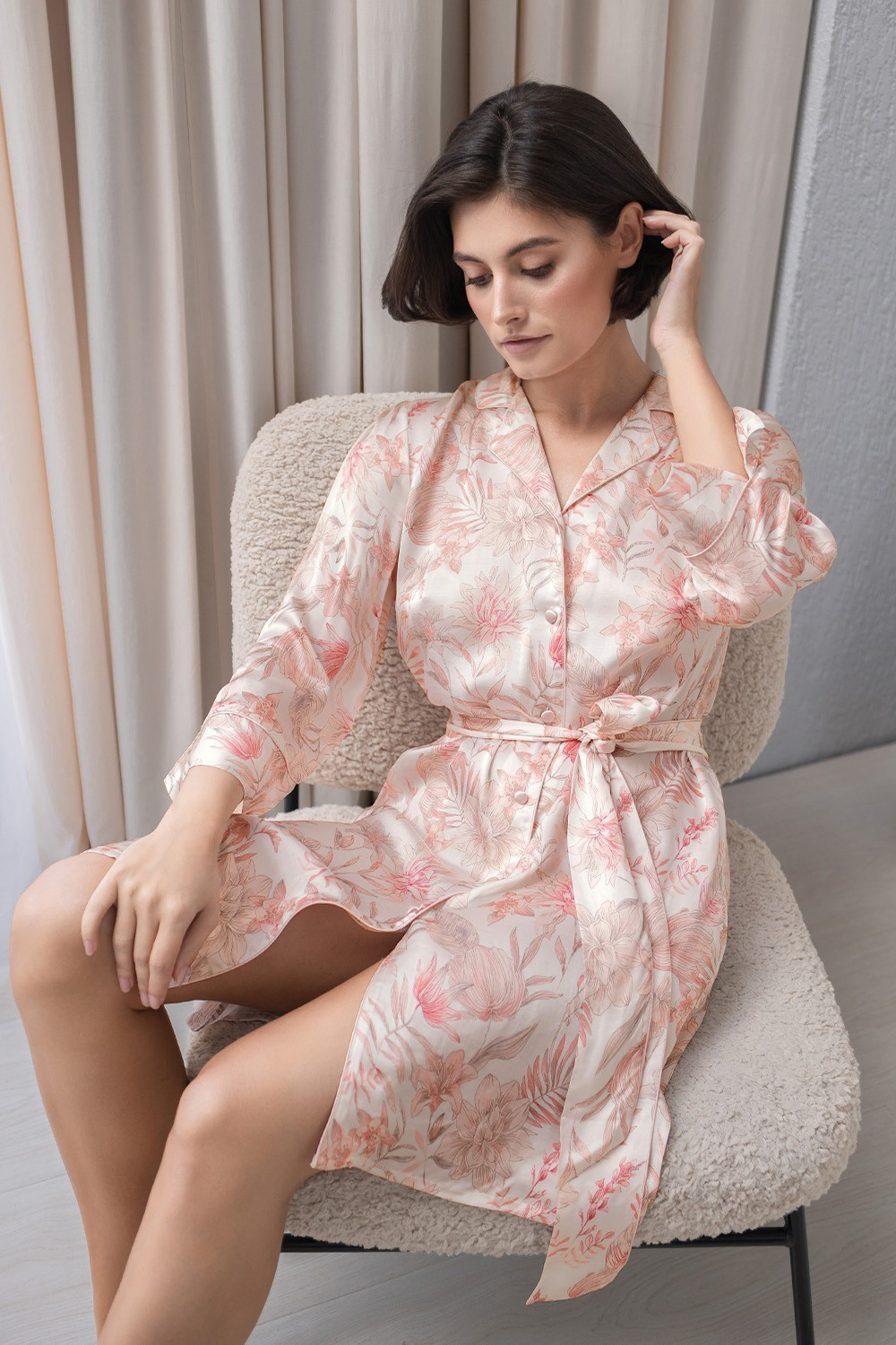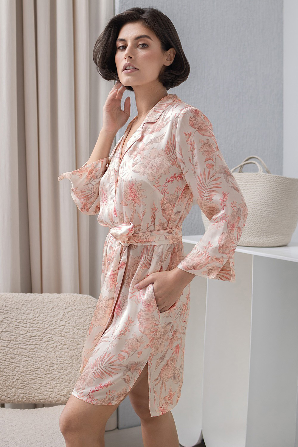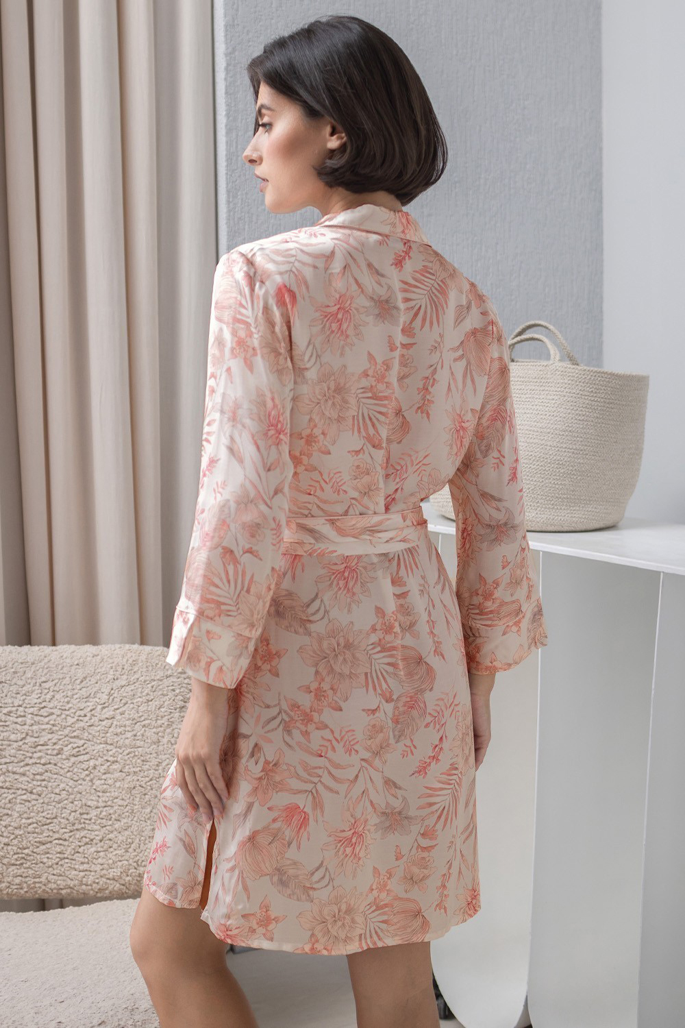 Короткий халат на пуговицах Mia-Amore с рукавом длиной 3/4. Изделие выполнено из принтованного смесового шелка . По бокам обработаны карманы. Линию талии можно подчеркнуть за счет пояса, который идет в комплекте.