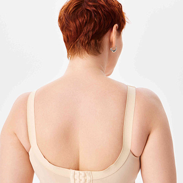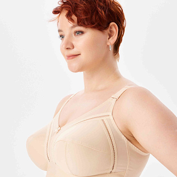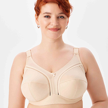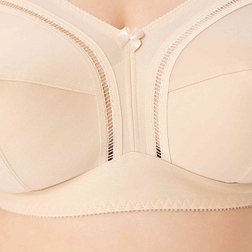 Бюстгальтер из неэластичного и эластичного трикотажных полотен. Без каркасов. Детали чашек на подкладке из тканого хлопкового полотна. Отделка тесьма с эффектом "мережки".