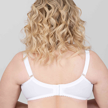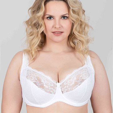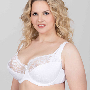 Полупоролоновый бюстгальтер на большую размерную группу из эластичного кружевного полотна. Верхняя деталь чашки выполнена из кружева, нижняя деталь продублированная мягким поролоном. Внутренняя часть продублированна 100% хлопком. Обеспечивает и усиливает естественную поддержку груди. Широкие бочки из микрофибры укреплены вертикальными каркасами, которые помогают сохранять форму стана. Бретели из эластичной тесьмы.