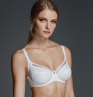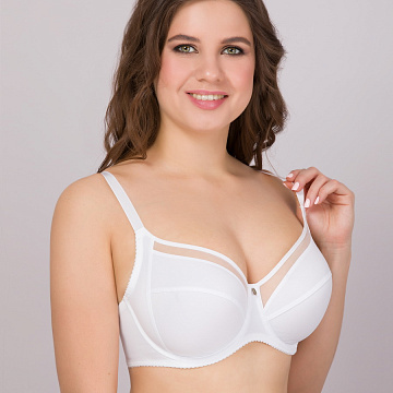 Бюстгальтер из эластичного полотна и трикотажного полотна, на каркасах. Мягкие чашки с двойным членением. Боковая корректирующая деталь. Расширенная бретель. Отделка — подвеска. Застёжка в 4 ряда крючков.