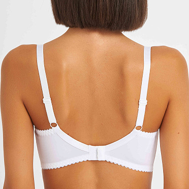 Бюстгальтер с полумягкими чашками на каркасах. Чашка сшивная, с тройным диагональным членением. Нижняя деталь продублирована легким современным наполнителем, обеспечивающим дополнительную поддержку груди, ее внутренняя сторона состоит из хлопкового полотна, внешняя из микрофибры. Верхняя часть чашки выполнена из эластичного сетчатого полотна на подкладке из стабилизирующей сетки. Пояс выполнен из эластичного полотна с микрофиброй. Бретели несъемные, регулируемые по всей длине.
